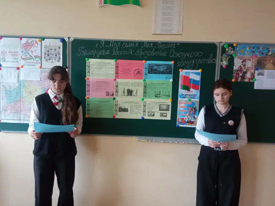 В апреле в рамках проекта "Я. Моя семья. Моя Родина" для учащихся 8-х классов прошло информационное занятие, посвященное Дню единения народов Беларуси и России. Ребята узнали об истории создания Союзного государства, его основных символах и значимых совместных проектах. В ходе занятия школьники обсудили, как сотрудничество двух стран помогает в экономике, культуре и социальной защите граждан. Учащиеся пришли к выводу, что союз Беларуси и России — это пример добрососедства и взаимовыгодного партн